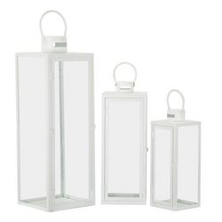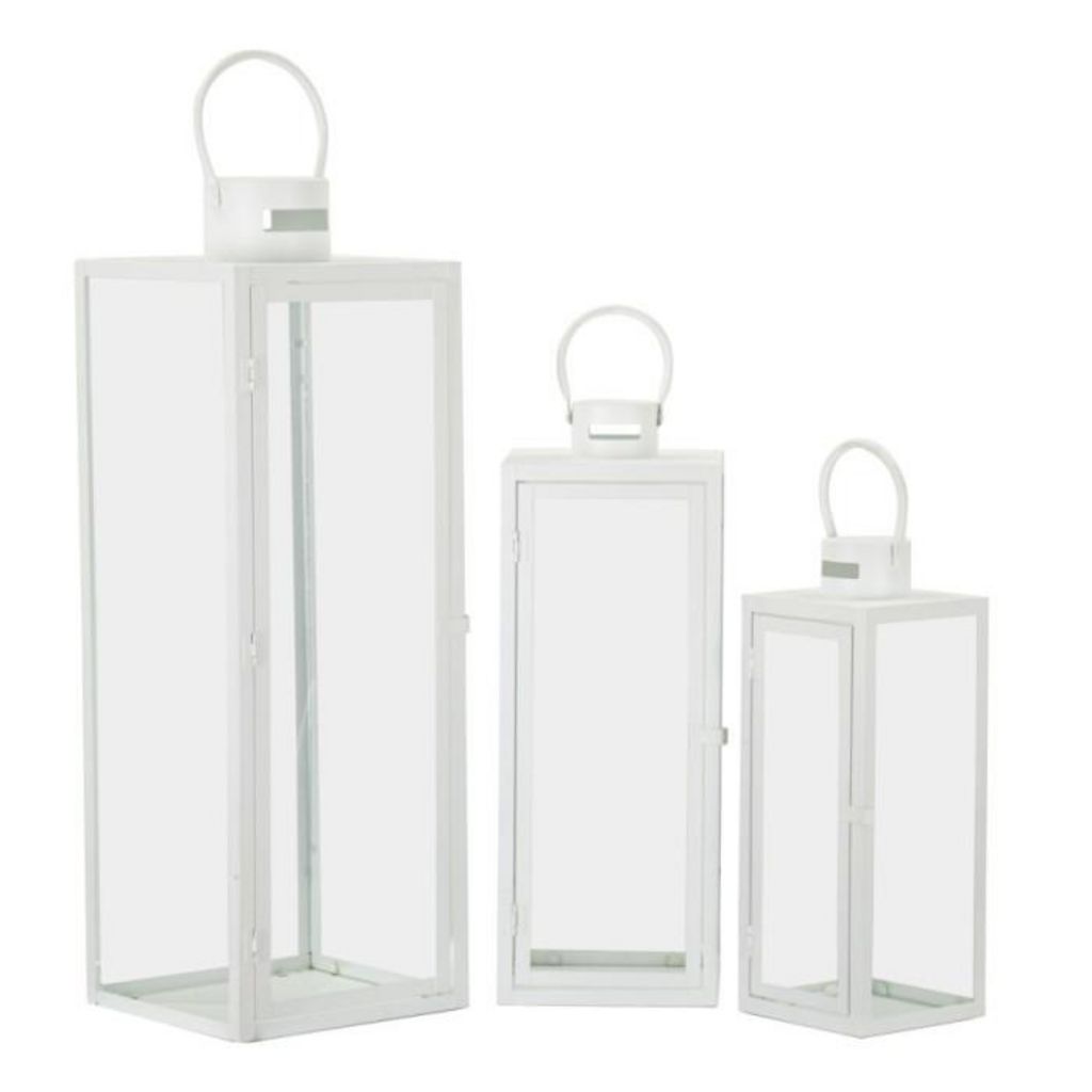 Informations Techniques : Dimensions : Taille 1 : L. 14 x l. 14 x H. 39 cm Taille 2 : L. 18 x l. 18 x H. 49,5 cm Taille 3 : L. 22 x l. 22 x H. 66 cm Matières : Métal & Verre Spécificités : Déco & Utile Lot de 3 lanternes Avec poignées Ouverture porte Poids : 8 kg Couleur : Blanc