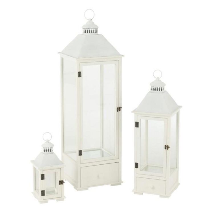 Informations Techniques : Dimensions : Taille 1 : L. 17 x l. 17 x H. 36,5 cm Taille 2 : L. 24,5 x l. 24,5 x H. 71,5 cm Taille 3 : L. 32 x l. 32 x H. 105,5 cm Matières : 50% Bois (Sapin), 30% Métal & 20% Verre Spécificités : Déco & Fonctionnel Lot de 3 lanternes Design tour Avec anse Ouverture porte