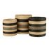 Informations Techniques : Dimensions : Taille 1 : D. 40 x H. 40 cm Taille 2 : D. 36 x H. 36 cm Taille 3 : D. 31 x H. 33 cm Matière : Raphia Spécificités : Déco & Utile Lot de 3 paniers de rangement Rayures noires Forme ronde Poids : 2,08 kg Couleur : Naturel & Noir