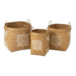 Informations Techniques : Dimensions : Taille 1 : L. 30 x l. 30 x H. 35 cm Taille 2 : L. 40 x l. 40 x H. 38 cm Taille 3 : L. 50 x l. 50 x H. 40 cm Matière : 100% Bambou Spécificités : Pratique & Tendance Lot de 3 paniers déco Avec anses Motif abstrait Style oriental Poids : 1,91 kg Couleur : Nature