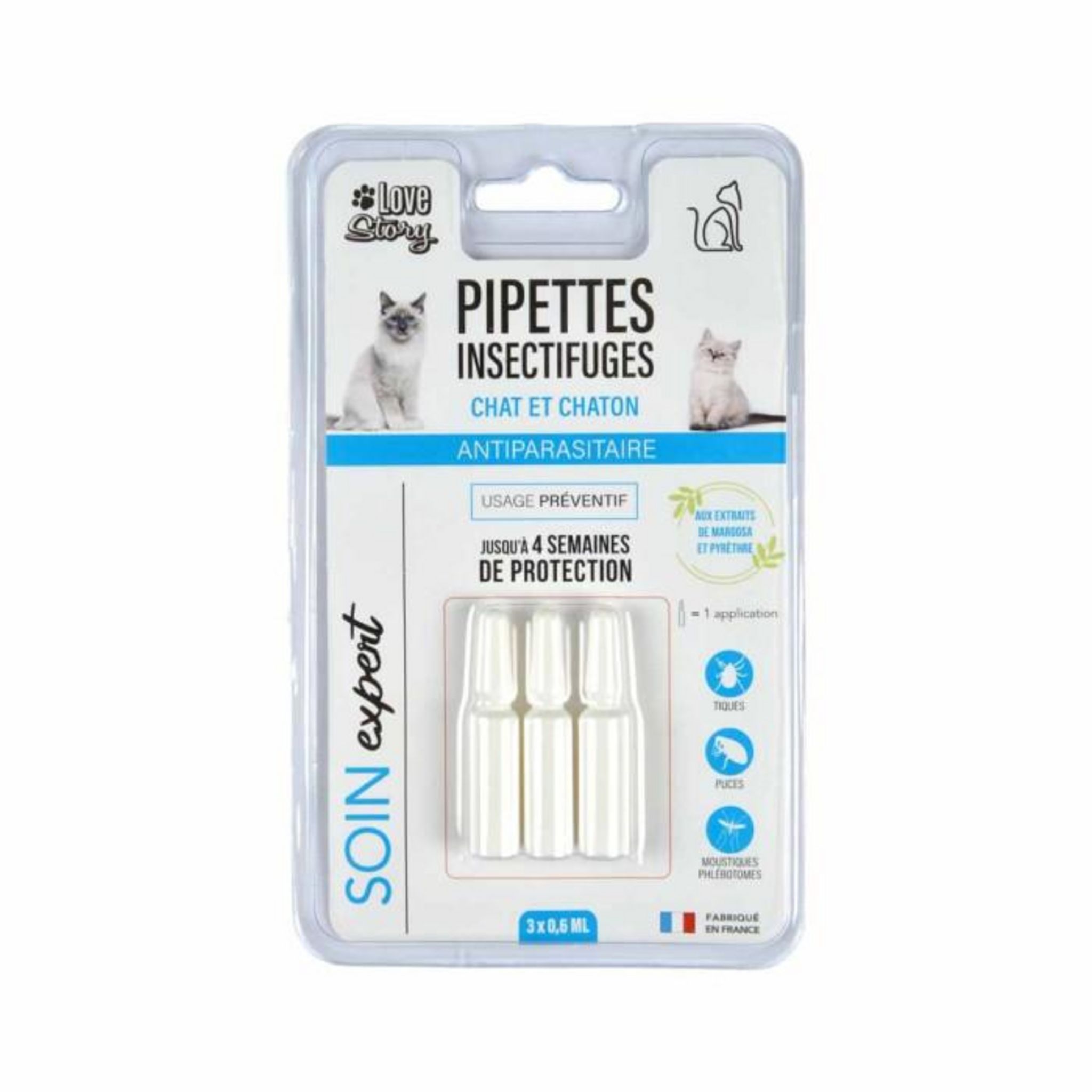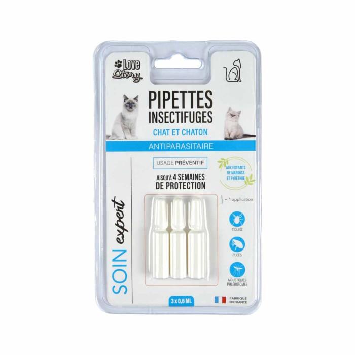Informations Techniques : Matière : Plastique Spécificités : Pratique & Utile Lot de 3 Pipettes Insectifuges Pour Chat & Chaton Usage Préventif 1 Pipette = 1 Application Jusqu'à 4 Semaines de Protection Aux Extraits de Margosa & Pyrèthre Soin Expert S'utilise pour les Tiques, les Puces & les Mousti