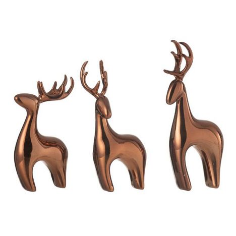 Informations Techniques : Dimensions : L. 7 x l. 4 x H. 16 cm Matières : 55% Chaux (Poudre) & 45% Résine Spécificités : Chic & Coloré Lot de 3 rennes déco Finition brillante Poids : 0,5 kg Couleur : Cuivre