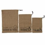 Informations Techniques : Dimensions : L. 39 x l. 28 x H. 41,5 cm Matières : Textile & Jute Spécificités : Pratique & Utile Lot de 3 Sacs de conservation En toile de jute Garder à l'abri de la lumière 3 Tailles différentes 100% Naturel Lavable & Réutilisable Agissons pour notre planète Cordelette