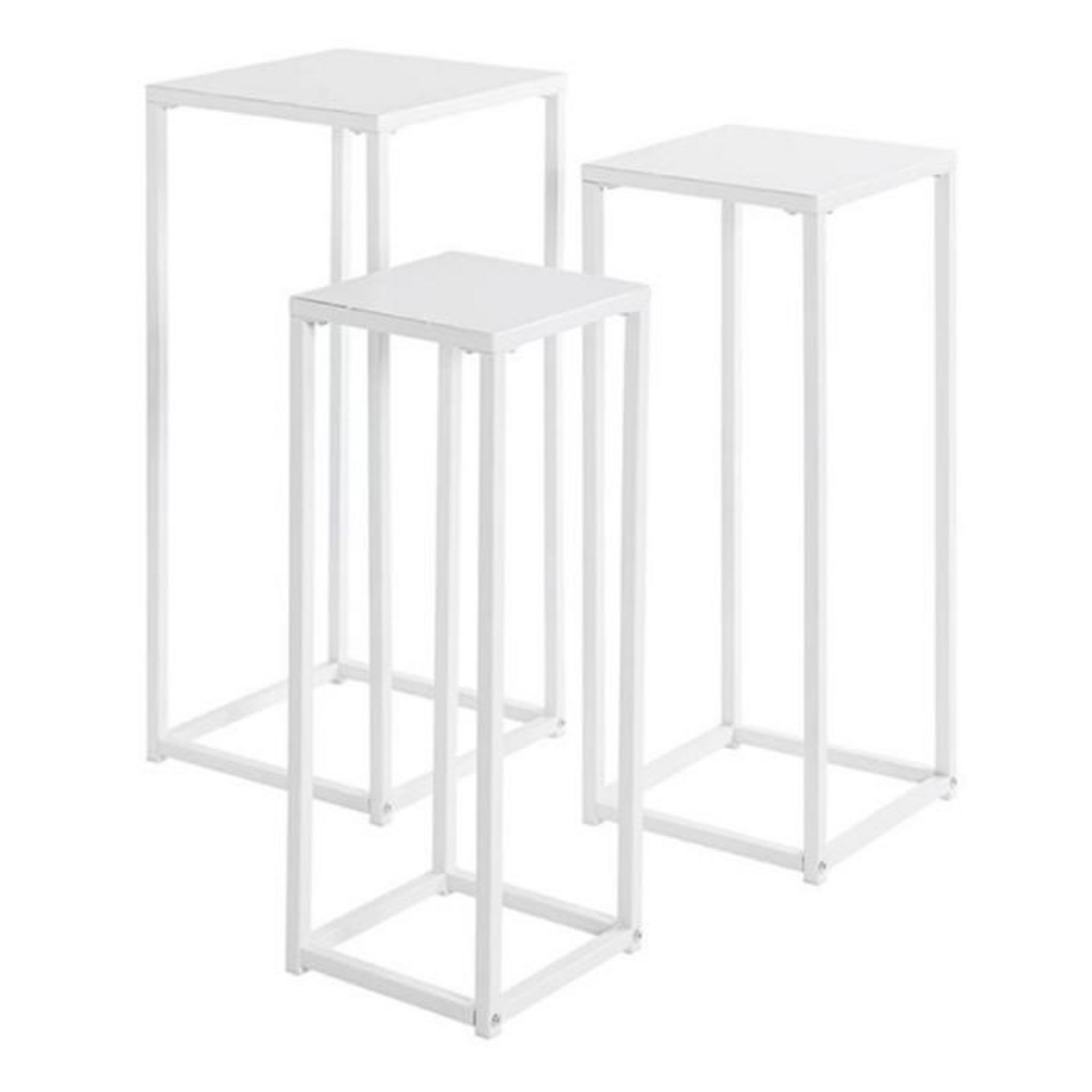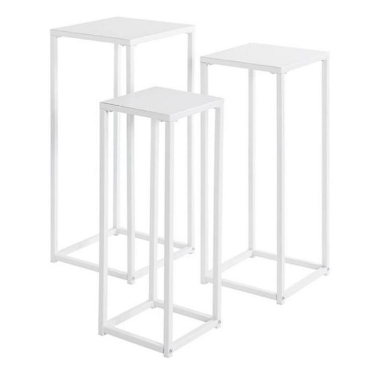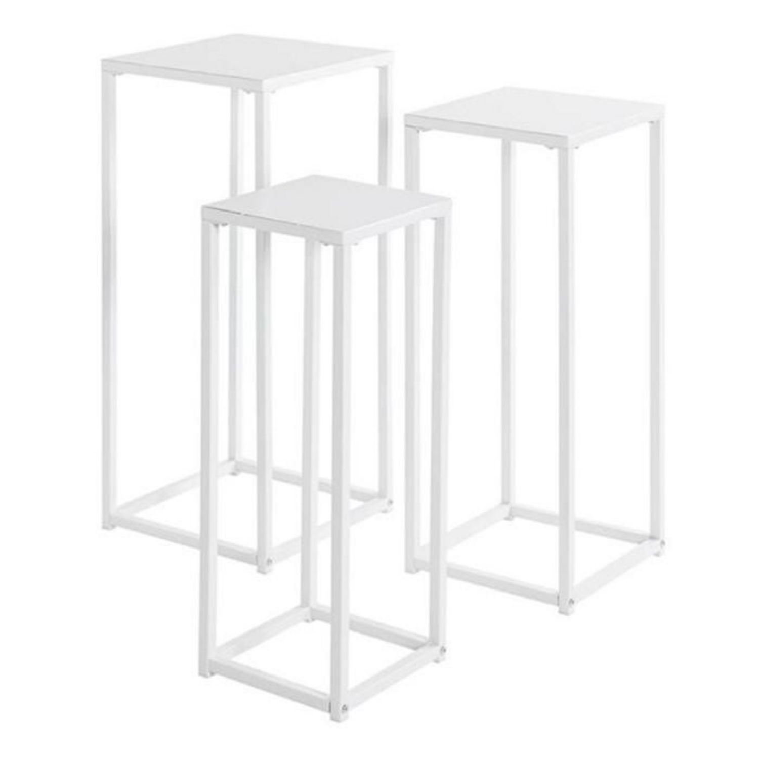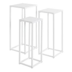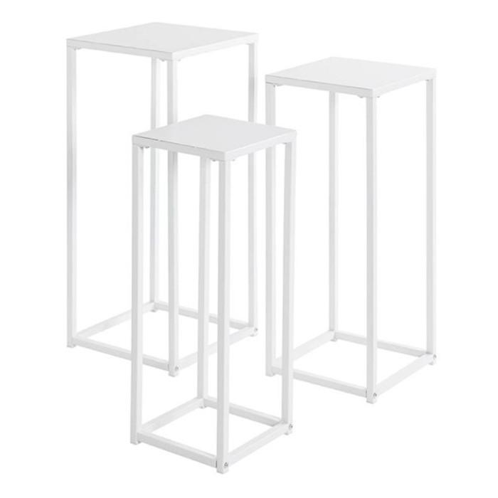 Informations Techniques : Dimensions : Taille 1 : L. 22 x l. 22 x H. 61 cm Taille 2 : L. 26 x l. 26 x H. 66 cm Taille 3 : L. 30 x l. 30 x H. 71 cm Matière : Métal Spécificités : Moderne & Tendance Lot de 3 sellettes Empilable Forme carrée Nombre de colis : 1 Poids : 5,85 kg Couleur : Blanc