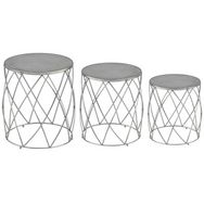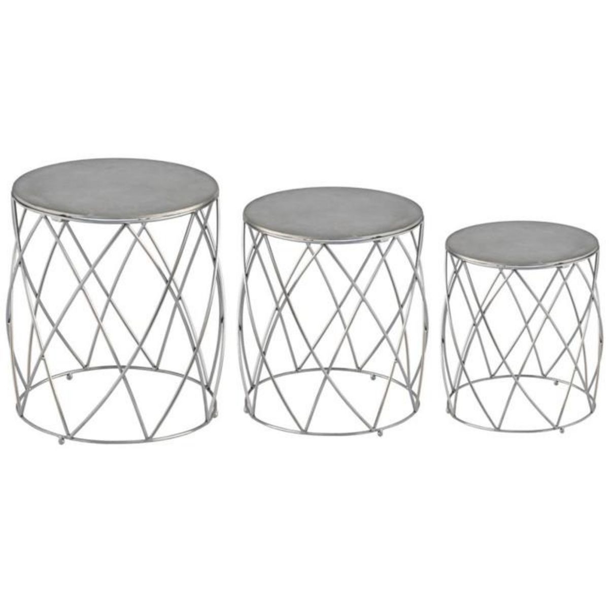 Informations Techniques : Dimensions : Petit : D. 36 x H. 41 cm Moyen : D.41 x H. 46 cm Grand : D. 46 x H. 51 cm Matières : Métal Spécificités : Lot de 2 Tabourets Design & Elegant Vendu en lot de 3 Nombre de colis : 1 Couleur : Argent