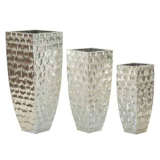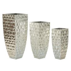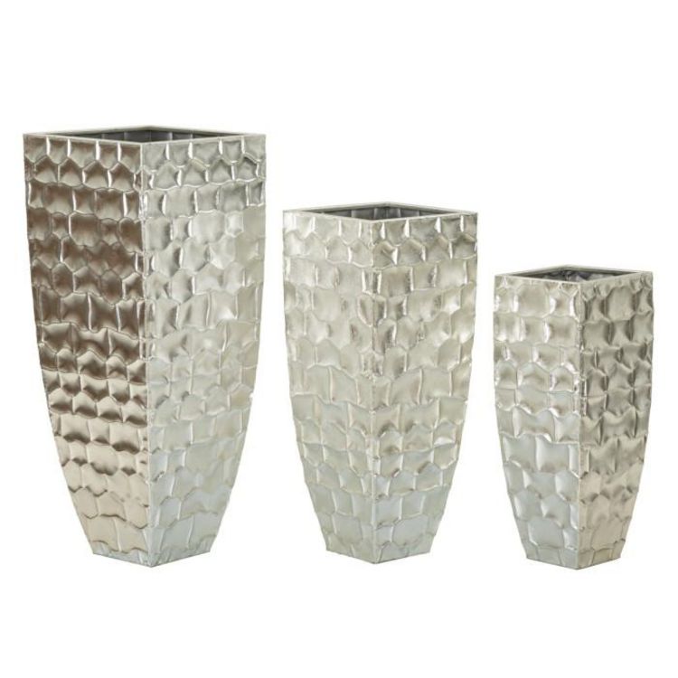 Informations Techniques : Dimensions : Taille 1 : L. 24,5 x l. 24,5 x H. 62,2 cm Taille 2 : L. 30,5 x l. 30,5 x H. 75,6 cm Taille 3 : L. 38,1 x l. 38,1 x H. 90,8 cm Matière : Métal Spécificités : Élégant & Intemporel Lot de 3 vases design Motifs en relief Poids : 11,37 kg Couleur : Argent