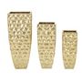 Informations Techniques : Dimensions : Taille 1 : L. 23 x l. 23 x H. 63 cm Taille 2 : L. 30,5 x l. 30,5 x H. 76 cm Taille 3 : L. 38 x l. 38 x H. 94 cm Matière : Métal Spécificités : Élégant & Intemporel Lot de 3 vases design Motifs irréguliers en relief Poids : 11,37 kg Couleur : Or