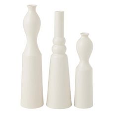 Informations Techniques : Dimensions : Taille 1 : L. 6 x l. 6 x H. 24 cm Taille 2 : L. 8 x l. 8 x H. 30 cm Taille 3 : L. 7 x l. 7 x H. 32 cm Matière : Porcelaine Spécificités : Déco & Original Lot de 3 vases design Différentes formes Finition mate Poids : 1,23 kg Couleur : Blanc