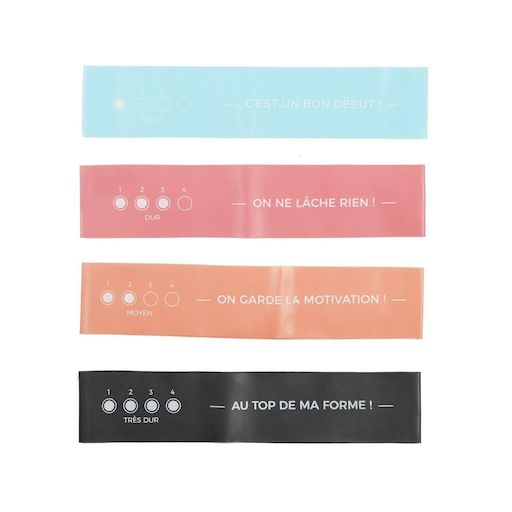 Informations Techniques : Dimensions : L. 19 x l. 9 x H. 3 cm Matière : Caoutchouc Spécificités : Pratique & Utile Lot de 4 Bandes de Résistance Spécial Fitness Pour tous les Niveaux 4 Intensités différentes Facile à Transporter & à Stocker S'utilise pour un programme Minceur, l'Entraînement Muscul