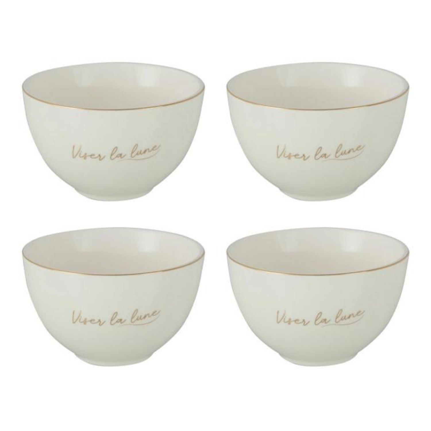 Informations Techniques : Dimensions : D. 10,6 x H. 6,5 cm Matière : 100% Porcelaine Spécificités : Utile & Élégant Lot de 4 bols Inscription viser la lune Forme ronde Poids : 0,22 kg Couleur : Blanc & Or