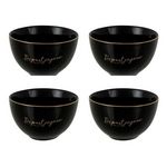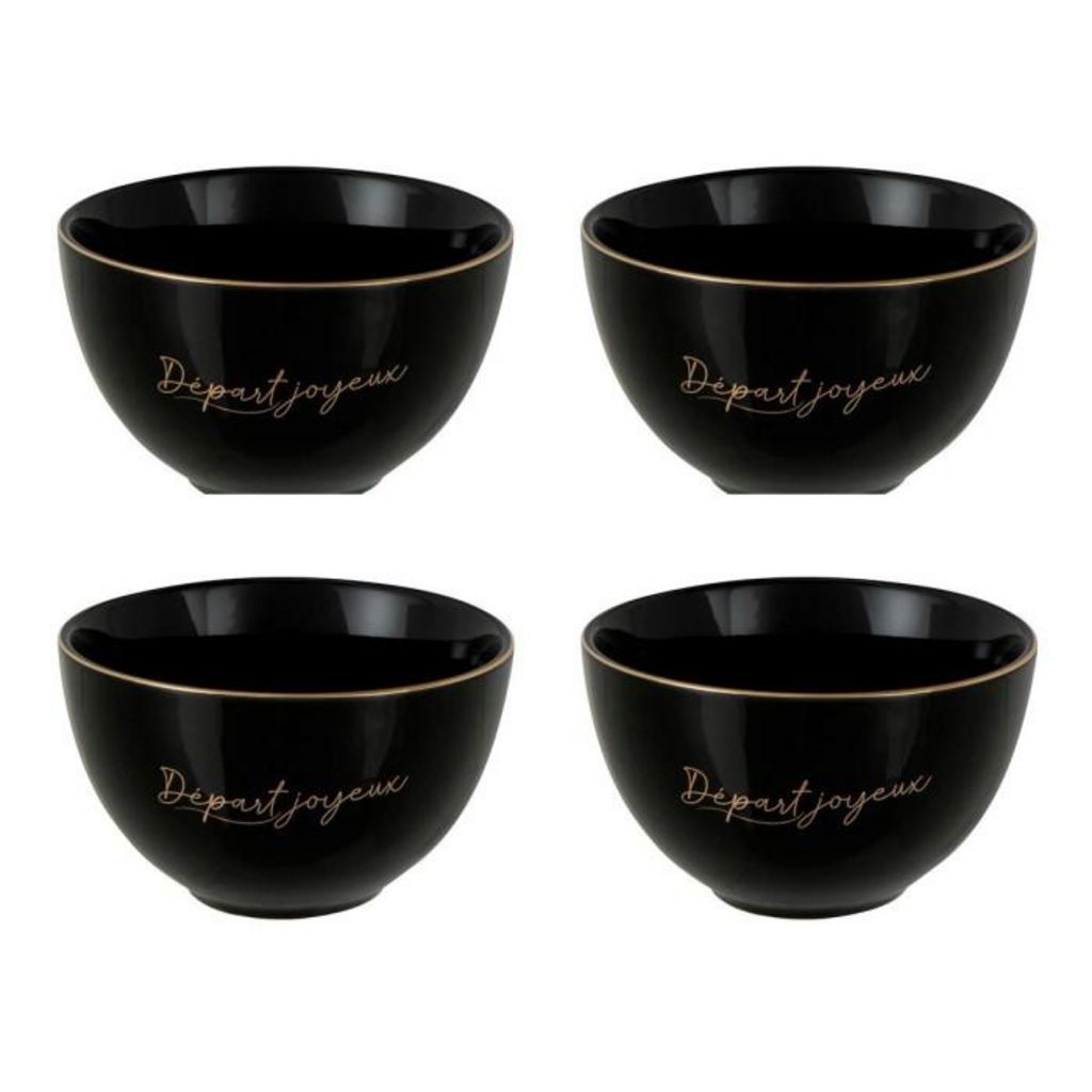 Informations Techniques : Dimensions : D. 10,6 x H. 6,5 cm Matière : 100% Porcelaine Spécificités : Utile & Élégant Lot de 4 bols Inscription départ joyeux Forme ronde Poids : 0,22 kg Couleur : Noir & Or