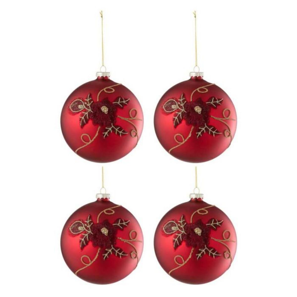Informations Techniques : Dimensions : D. 12 x H. 12 cm Matière : 100% Verre Spécificités : Élégant & Festif Lot de 4 boules de Noël À suspendre Motifs fleurs Forme ronde Poids : 0,06 kg Couleur : Rouge