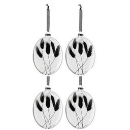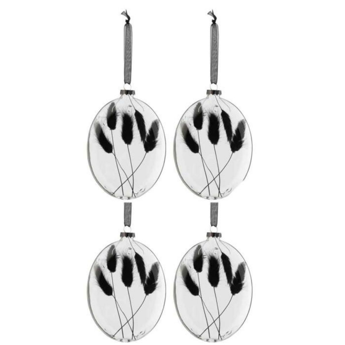Informations Techniques : Dimensions : L. 3,5 x l. 11 x H. 16 cm Matière : Verre Spécificités : Pratique & Chic Lot de 4 Boules de Noël Forme Ovale Design Fleur Séchée Poids : 0,035 kg Couleur : Noir