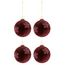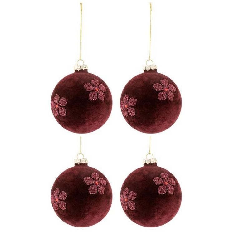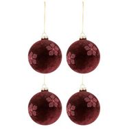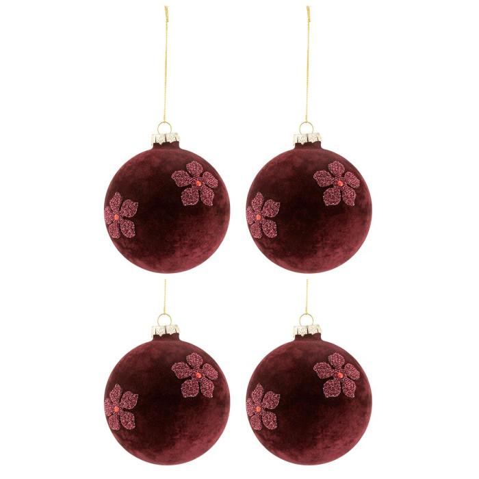 Informations Techniques : Dimensions : L. 10 x l. 10 x H. 10 cm Matière : Verre Spécificités : Design & Original Lot de 4 Boules de Noël Fome Ronde Design Fleurs Texture Velours Poids : 0,047 kg Couleur : Rouge Bordeaux