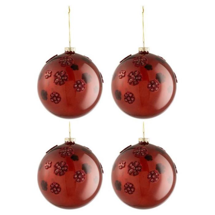 Informations Techniques : Dimensions : L. 12 x l. 12 x H. 12 cm Matière : Verre Spécificités : Design & Original Lot de 4 Boules de Noël Fome Ronde Design Fleurs Poids : 0,063 kg Couleur : Marron