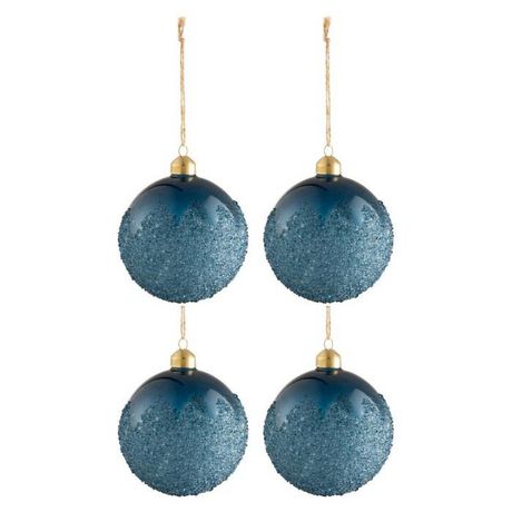 Informations Techniques : Dimensions : L. 10 x l. 10 x H. 10 cm Matière : Verre Spécificités : Design & Original Lot de 4 Boules de Noël Fome Ronde Effet Givré Poids : 0,064 kg Couleur : Bleu