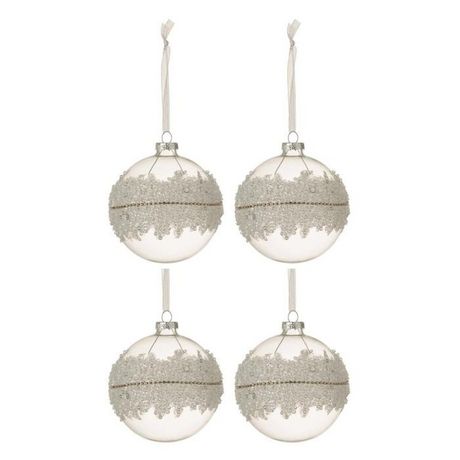 Informations Techniques : Dimensions : D. 10 x H. 10 cm Matière : Verre Spécificités : Chic & Festif Lot de 4 Boules de Noël Forme Ronde Effet Glacé Avec Diamants & Lignes Poids : 0,4 kg Couleur : Transparent