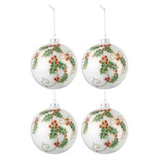 Informations Techniques : Dimensions : D. 10 x H. 10 cm Matière : Verre Spécificités : Pratique & Chic Lot de 4 Boules de Noël Forme Ronde Imprimé Houx Poids : 0,065 kg Couleur : Blanc, Vert & Rouge