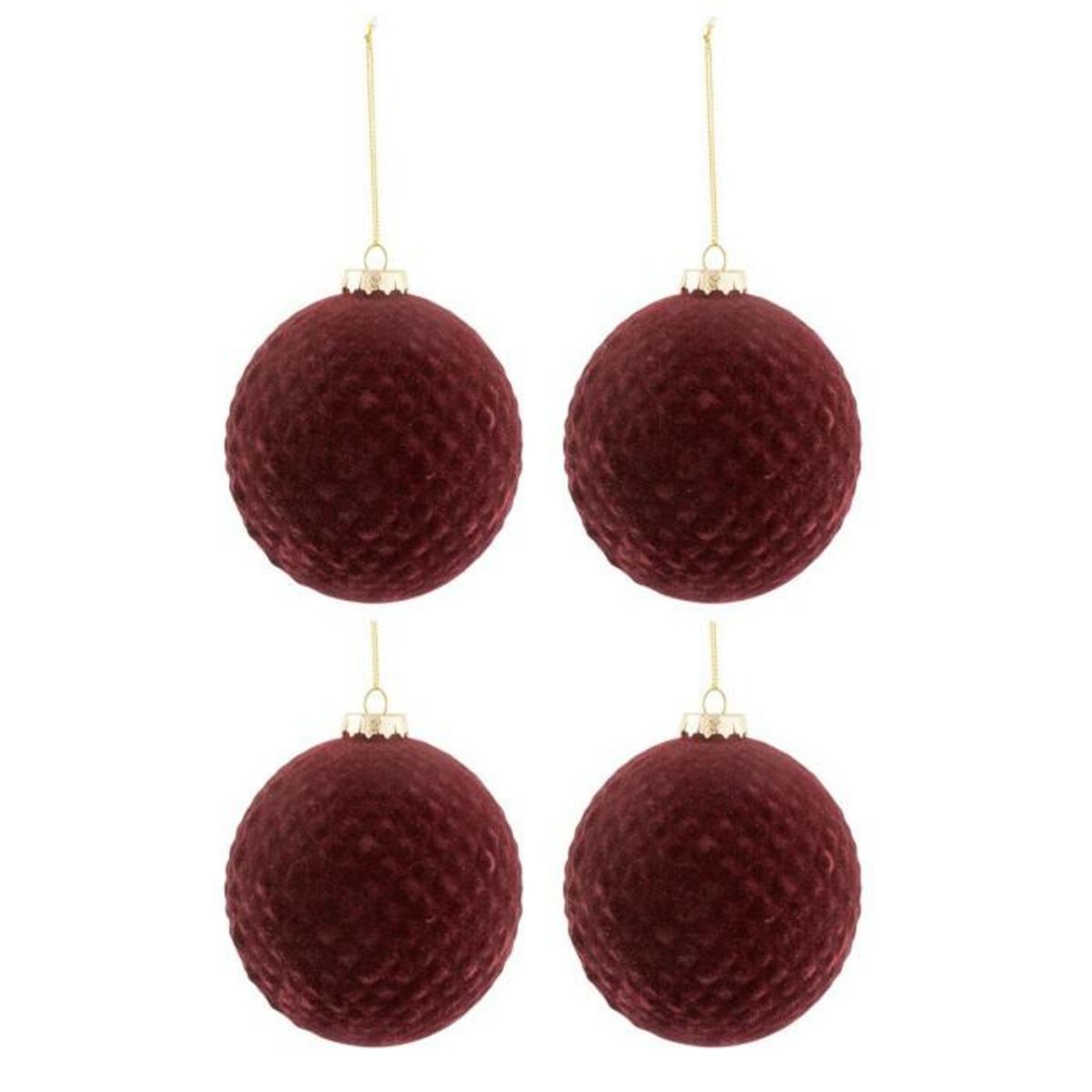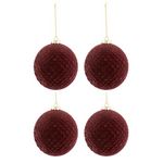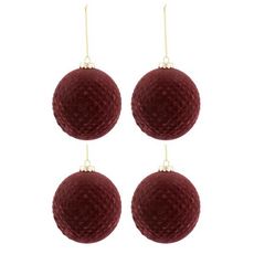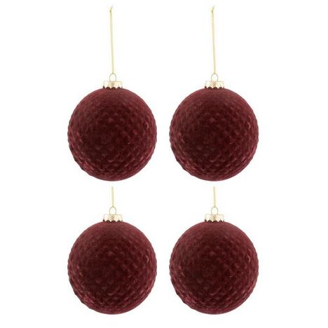 Informations Techniques : Dimensions : D. 10 x H. 10 cm Matière : Verre Spécificités : Chic & Festif Lot de 4 Boules de Noël Forme Ronde Motifs Velours Poids : 0,051 kg Couleur : Bordeaux