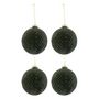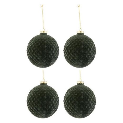Informations Techniques : Dimensions : D. 10 x H. 10 cm Matière : Verre Spécificités : Chic & Festif Lot de 4 Boules de Noël Forme Ronde Motifs Velours Poids : 0,052 kg Couleur : Vert Foncé
