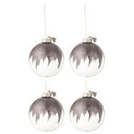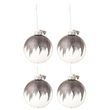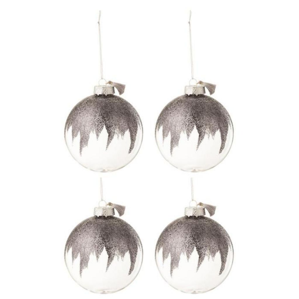 Informations Techniques : Dimensions : D. 12 x H. 12 cm Matière : Verre Spécificités : Chic & Festif Lot de 4 Boules de Noël Forme Ronde Avec Paillettes & Mini Floches Poids : 0,052 kg Couleur : Gris & Transparent