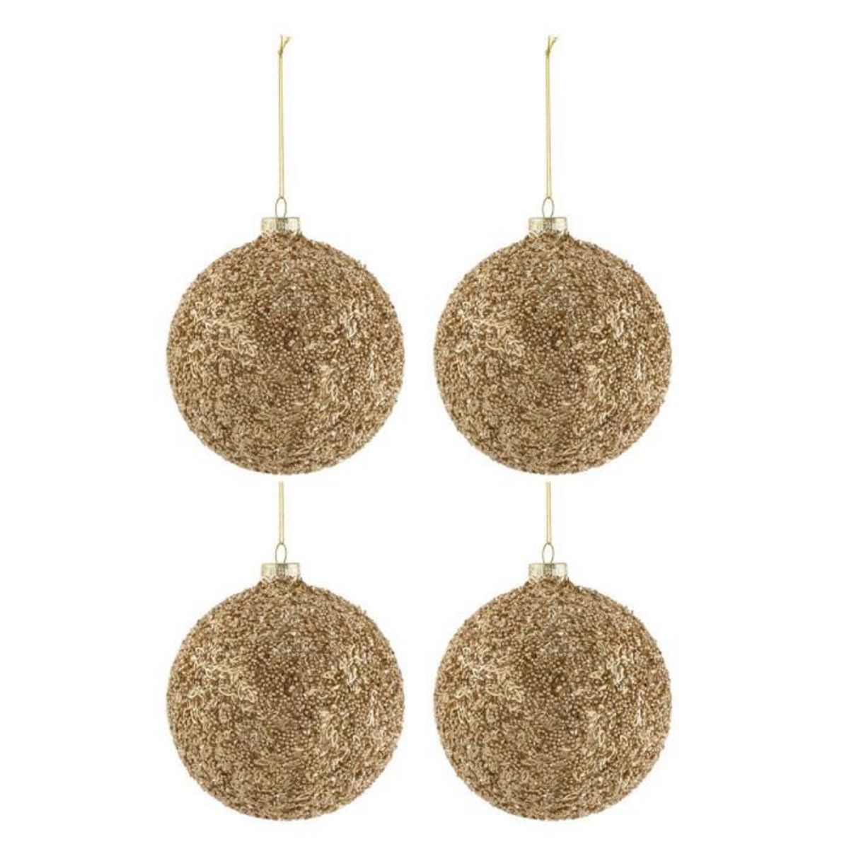 Informations Techniques : Dimensions : D. 12 x H. 12 cm Matière : Verre Spécificités : Pratique & Utile Lot de 4 Boules de Noël Forme Ronde Design Paillettes Poids : 0,11 kg Couleur : Or