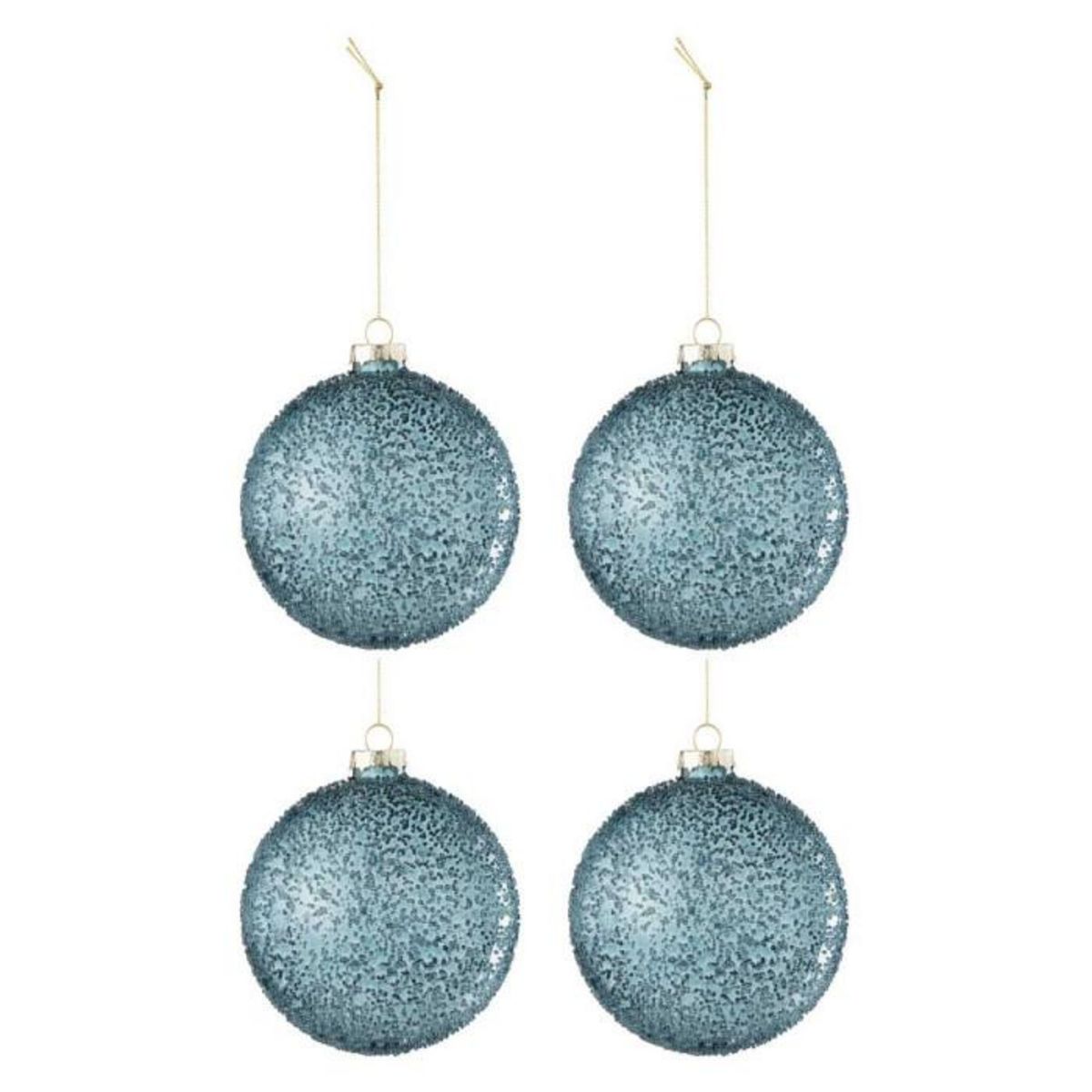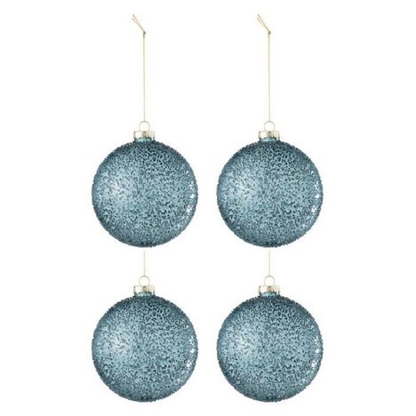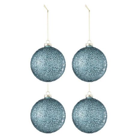 Informations Techniques : Dimensions : D. 10 x H. 10 cm Matière : 100% Verre Spécificités : Chic & Festif Lot de 4 boules de Noël À suspendre Avec perles Forme ronde Poids : 0,06 kg Couleur : Bleu