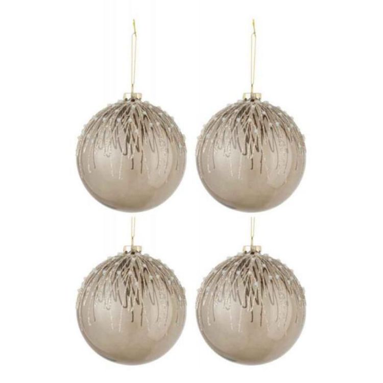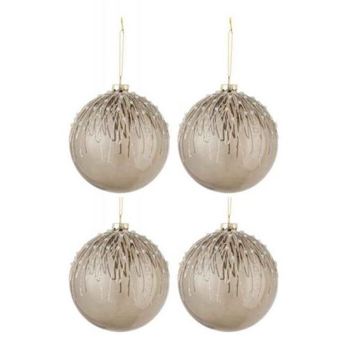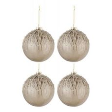 Informations Techniques : Dimensions : D. 12 x H. 12 cm Matière : Verre Spécificités : Pratique & Utile Lot de 4 Boules de Noël Forme Ronde Design Perles Avec Paillettes Poids : 0,071 kg Couleur : Gris