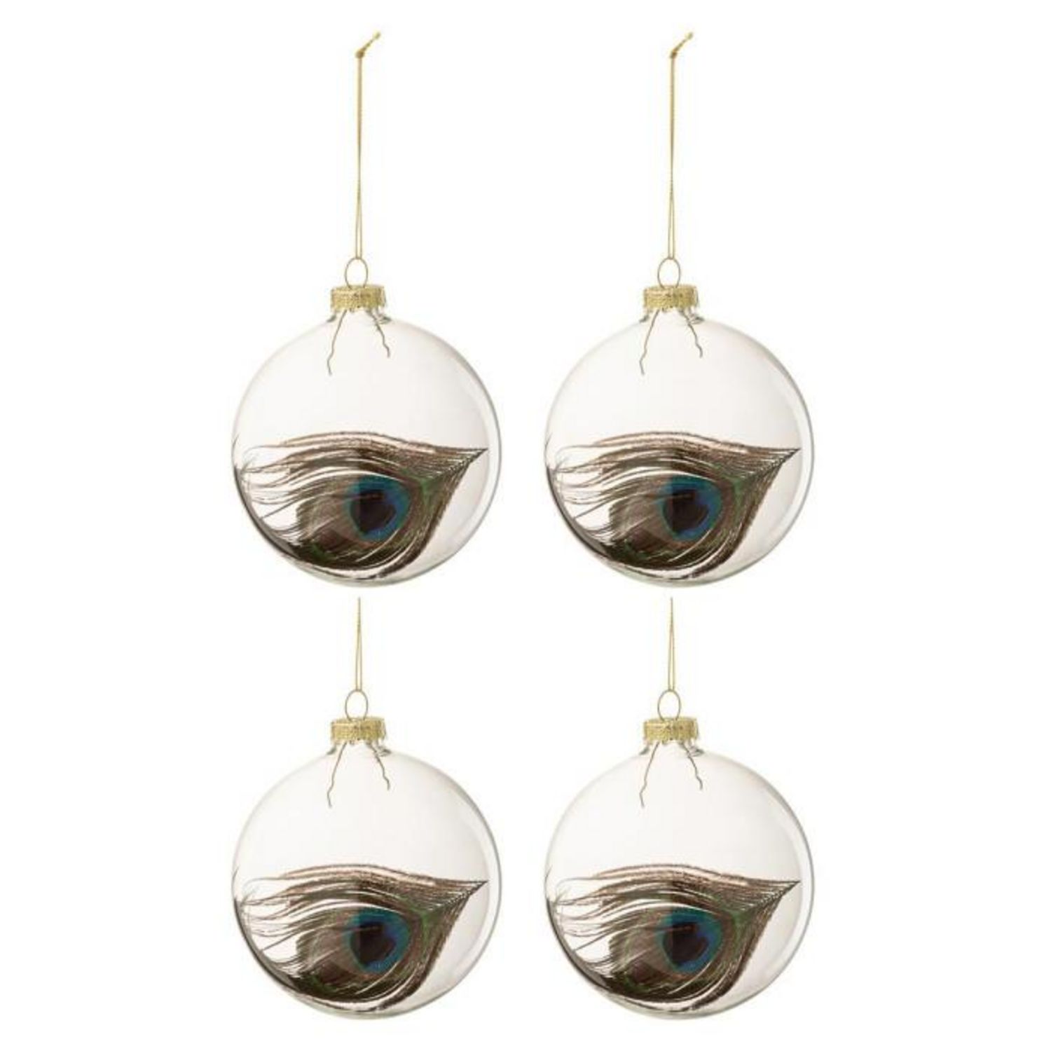 Informations Techniques : Dimensions : D. 10 x H. 10 cm Matière : Verre Spécificités : Chic & Festif Lot de 4 Boules de Noël Forme Ronde Avec Plumes de Paon Poids : 0,039 kg Couleur : Transparent