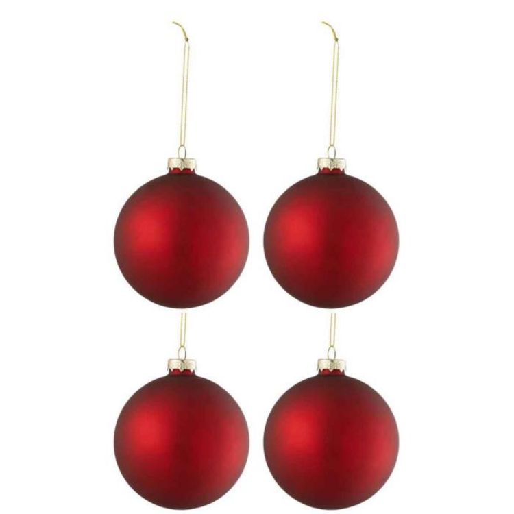 Informations Techniques : Dimensions : D. 10 x H. 10 cm Matière : Verre Spécificités : Tendance & Chic Lot de 4 Boules de Noël Forme Ronde Verre Épais Texture Mat Poids : 0,03 kg Couleur : Rouge