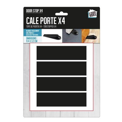 Informations Techniques : Dimensions : L. 11,4 x l. 3,2 cm Matière : Polypropylène Spécificités : Pratique & Utile Lot de 4 Cale-Portes Poids : 0,01 kg Couleur : Noir
