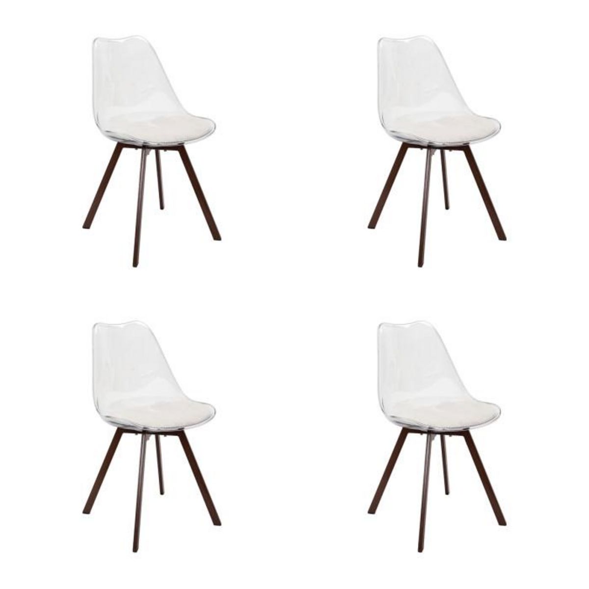 Informations Techniques : Dimensions : L. 52 x l. 46 x H. 82 cm Matières : Revêtement : Plastique Coussin : Polyester Rembourrage : Mousse de polyuréthane Structure : Métal Piètement : Métal Spécificités : Tendance & Confortable Lot de 4 chaises Assise et dossier transparent Coussin en tissu côtelé