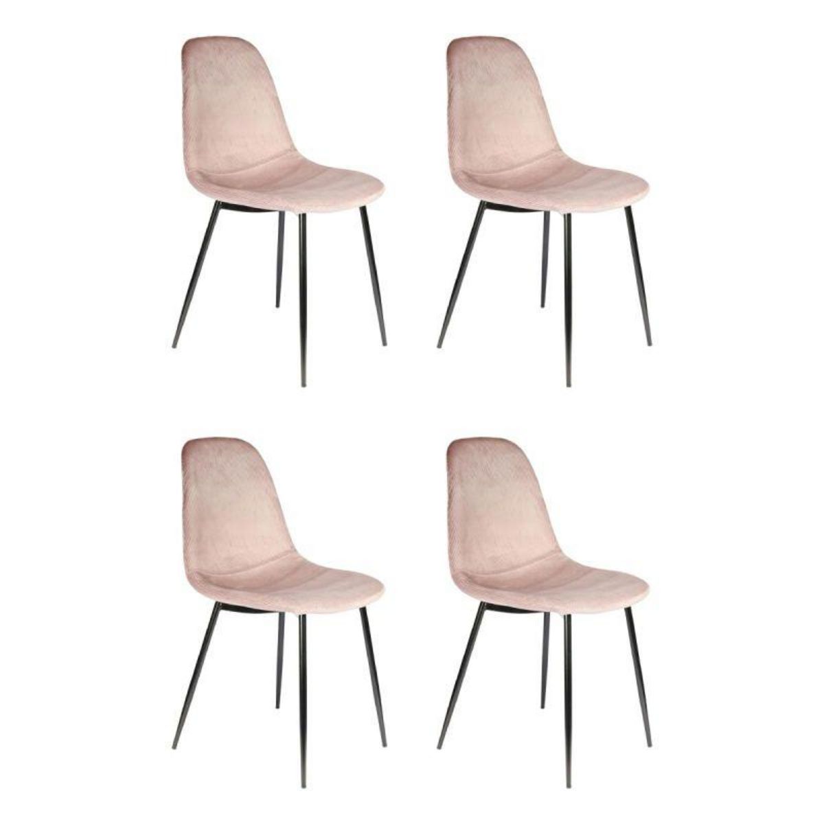 Informations Techniques : Dimensions : L. 54 x l. 44 x H. 85 cm Hauteur d'Assise : 48 cm Matières : Structure : Contreplaqué Revêtement : Polyester Piètement : Métal & Fer Rembourrage : Mousse Polyuréthane Spécificités : Pratique & Utile Lot de 4 Chaises design Revêtement en Velours Côtelé Pieds en