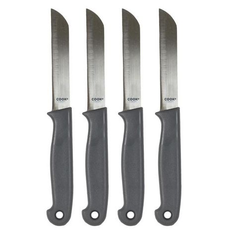 Informations Techniques : Dimensions : L. 17,5 x l. 2 x H. 1 cm Matières : Acier Inoxydable & Polypropylène Spécificités : Pratique & Solide Lot de 4 couteaux Lames dentelées Manches ergonomiques Poids : 0,01 kg Couleur : Gris