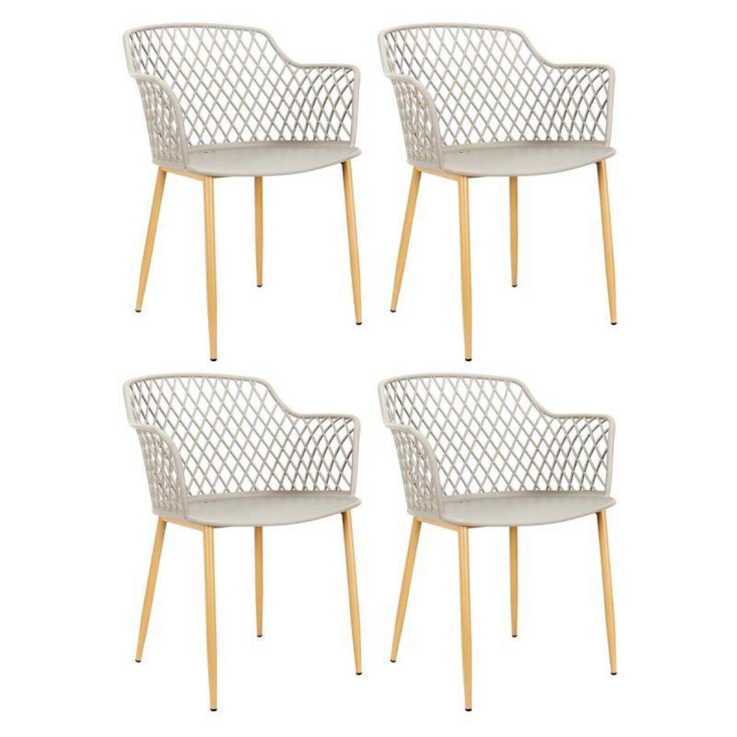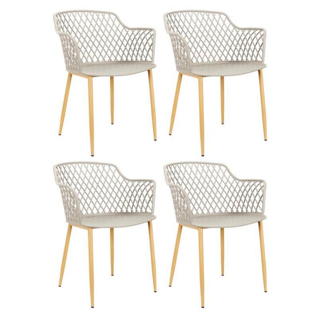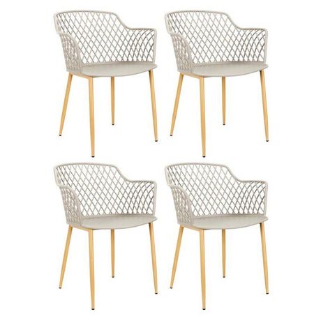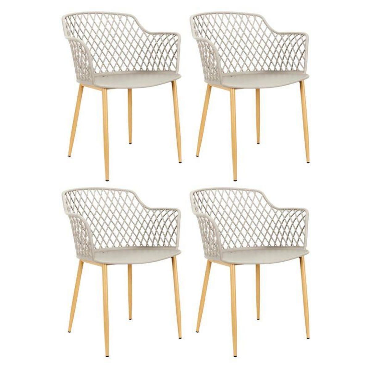 Informations Techniques : Dimensions : L. 54,1 x l. 62,2 x H. 80 cm Matière : Polypropylène Spécificités : Pratique & Utile Lot de 4 Fauteuils Assise Confortable Usage Extérieur Poids : 4,5 kg Couleur : Taupe