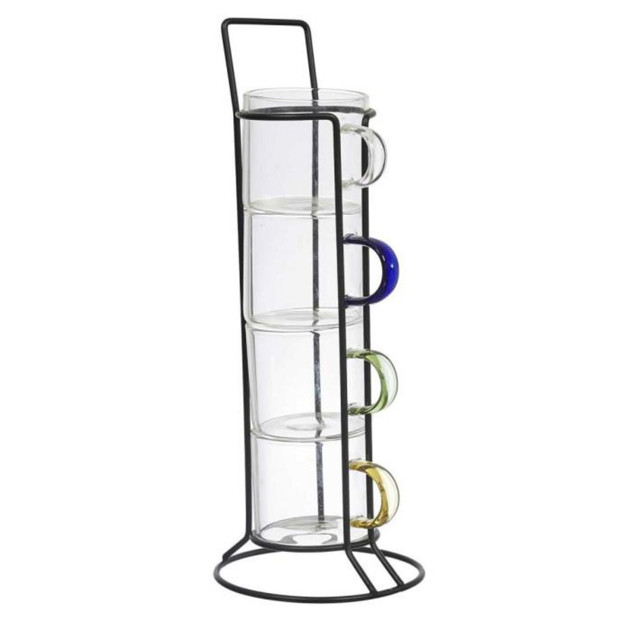 Informations Techniques : Dimensions : L. 8 x l. 5,5 x H. 5 cm Matières : 60% Verre & 40% Métal Spécificités : Pratique & Utile Lot de 4 tasses à café Avec support Poids : 0,3 kg Couleur : Transparent