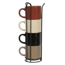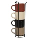 Informations Techniques : Dimensions : L. 8,5 x l. 7 x H. 7 cm Matières : 80% Grès & 20% Métal Spécificités : Pratique & Utile Lot de 4 tasses Avec support Capacité : 22 cl Poids : 0,26 kg Couleur : Multicolore