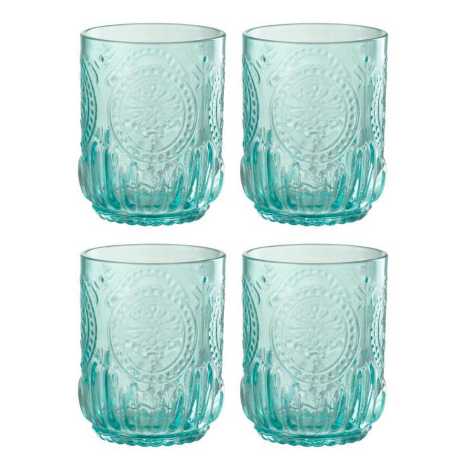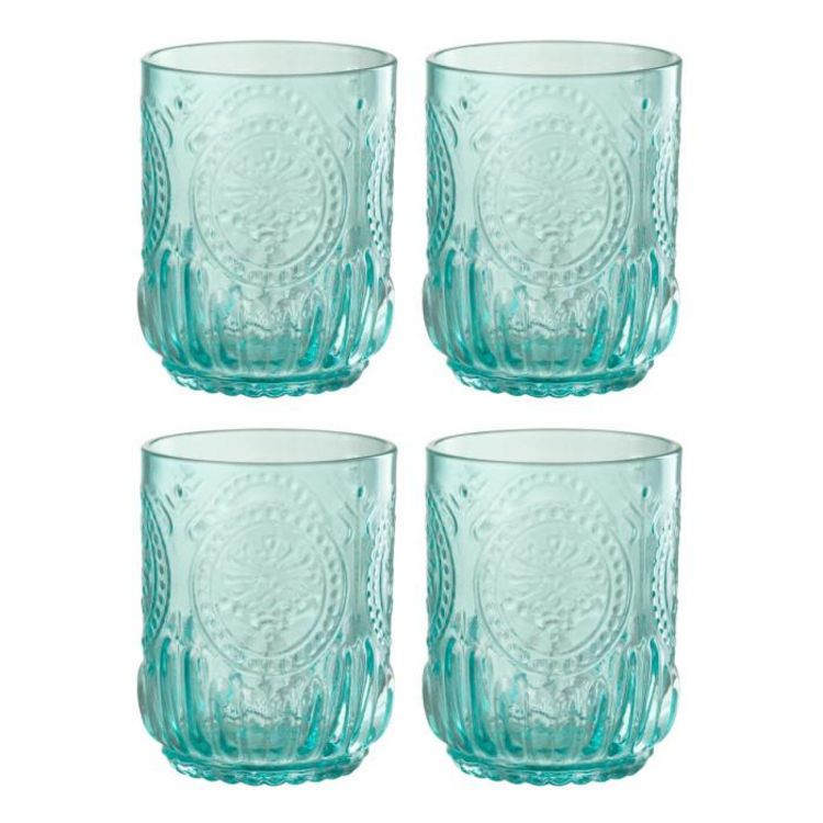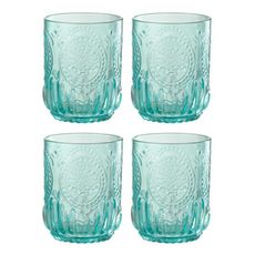 Informations Techniques : Dimensions : D. 7 x H. 9 cm Matière : 100% Verre Spécificités : Pratique & Utile Lot de 4 verres Motifs en relief Capacité : 32 cl Poids : 0,48 kg Couleur : Turquoise