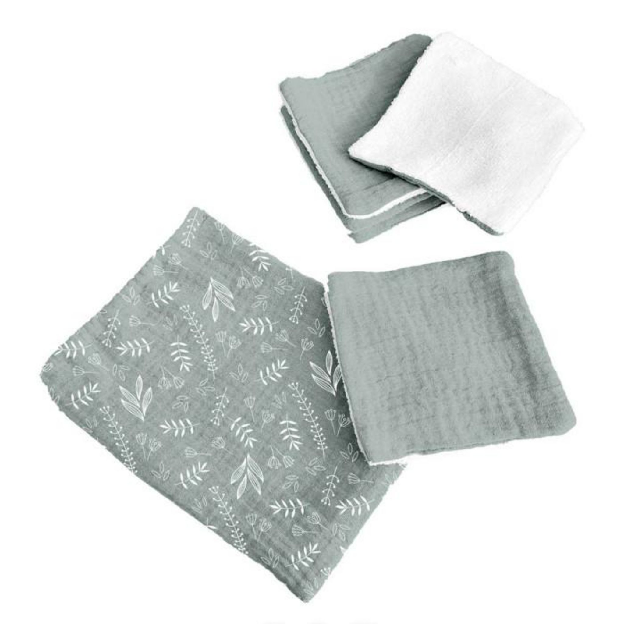 Informations Techniques : Dimensions : L. 11 x l. 11 cm Matière : Gaze de Coton Spécificités : Pratique & Réutilisable Lot de 5 Débarbouillettes Forme Carrée Pour Bébé Avec Pochon Motif Imprimé Texture Éponge Poids : 0,04 kg Couleur : Vert Céladon