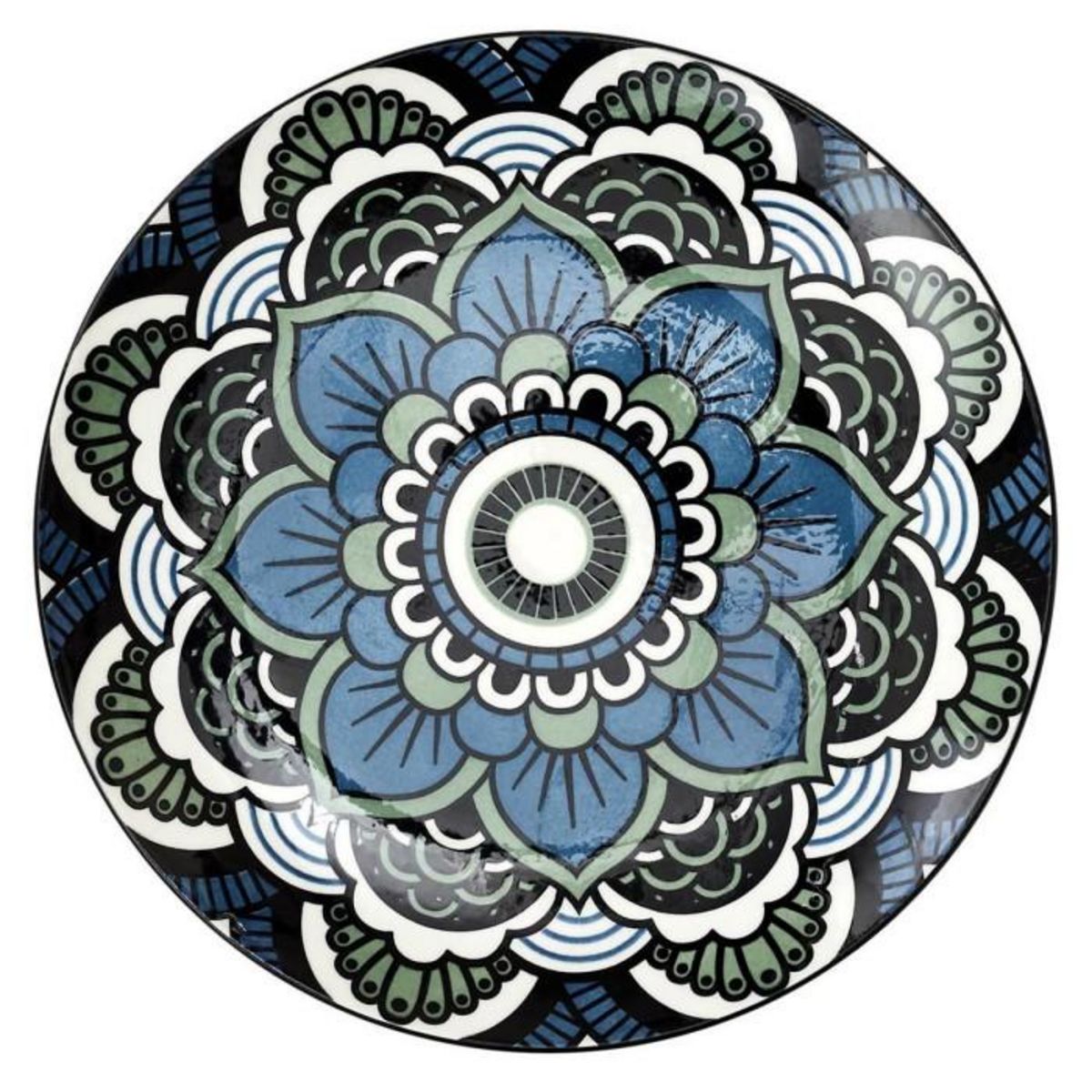 Informations Techniques : Dimensions : D. 19 x H. 2 cm Matières : Céramique & Porcelaine Spécificités : Tendance & Design Lot de 6 Assiettes à Dessert Forme Ronde Motif Mandala Poids : 0,29 kg Couleur : Bleu