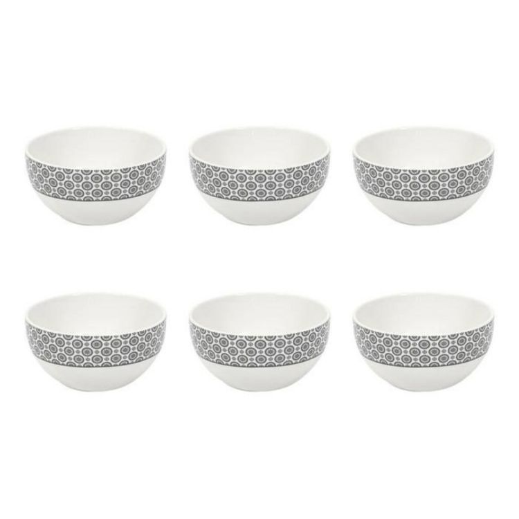 Informations Techniques : Dimensions : D. 7 cm Matières : Porcelaine Spécificités : Pratique & Utile Lot de 6 Bols Forme Ronde A Motifs Contenance : 60 cl Couleur : Gris