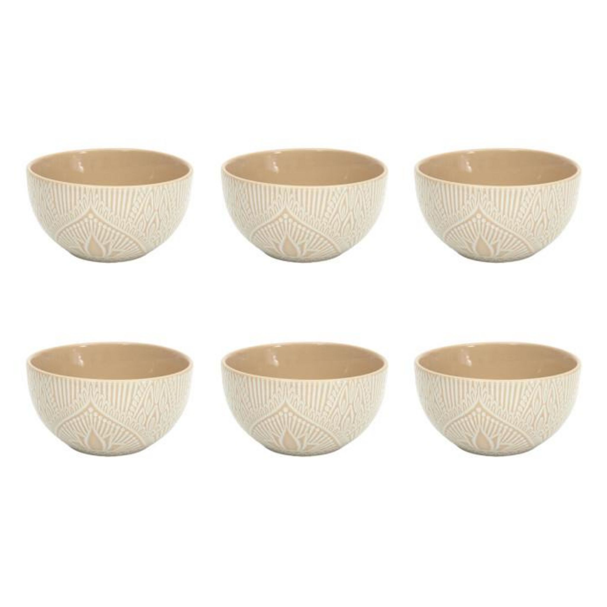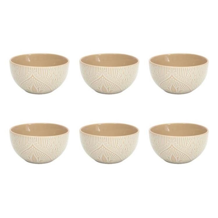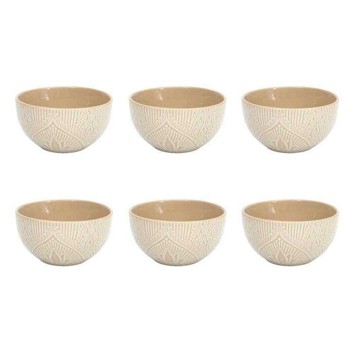 Informations Techniques : Dimensions : D. 13,8 x H. 7,4 cm Matière : 100% Grès Spécificités : Design & Utile Lot de 6 bols Imprimé mandala Forme ronde Capacité : 65 cl Compatibles : Lave-vaisselle, micro-ondes et congélateur Poids : 0,39 kg (à l'unité) Couleur : Beige