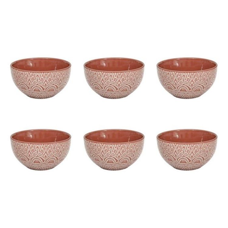 Informations Techniques : Dimensions : D. 13,8 x H. 7,4 cm Matière : 100% Grès Spécificités : Design & Utile Lot de 6 bols Imprimé mandala Forme ronde Capacité : 65 cl Compatibles : Lave-vaisselle, micro-ondes et congélateur Poids : 0,39 kg (à l'unité) Couleur : Terracotta