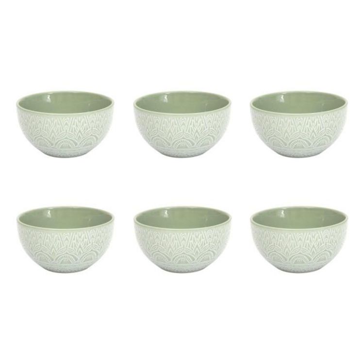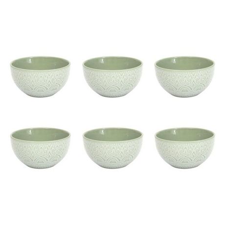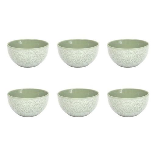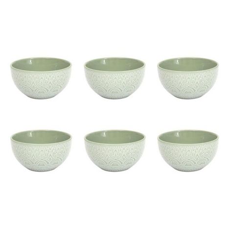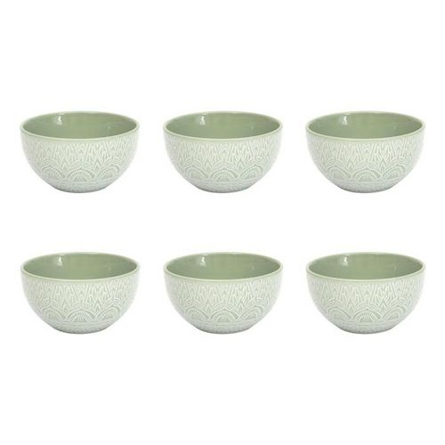 Informations Techniques : Dimensions : D. 13,8 x H. 7,4 cm Matière : 100% Grès Spécificités : Design & Utile Lot de 6 bols Imprimé mandala Forme ronde Capacité : 65 cl Compatibles : Lave-vaisselle, micro-ondes et congélateur Poids : 0,39 kg (à l'unité) Couleur : Vert