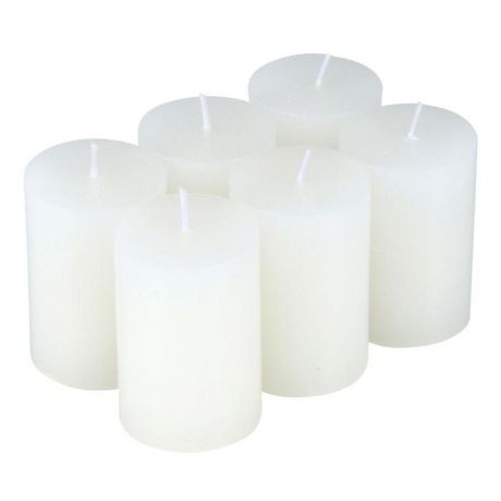 Informations Techniques : Dimensions : D. 4 x H. 6 cm Matière : Cire Spécificités : Utile & Élégante Lot de 6 bougies votives Sans parfum Taille universelle Durée de combustion : 6 heures Poids : 0,36 kg Couleur : Blanc