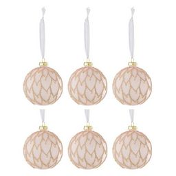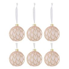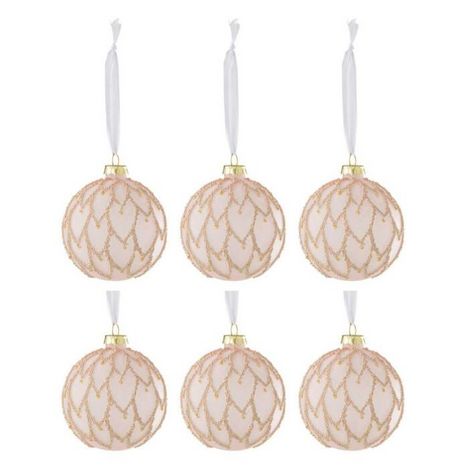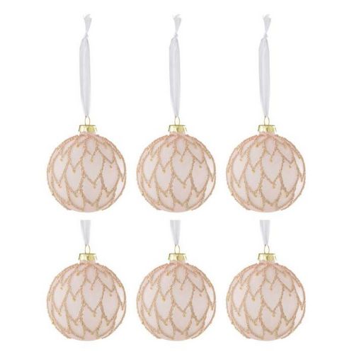 Informations Techniques : Dimensions : D. 8 x H. 8 cm Matière : 100% Verre Spécificités : Déco & Festif Lot de 6 boules de Noël À suspendre Design coeurs Avec perles Forme ronde Poids : 0,02 kg Couleur : Rose Clair