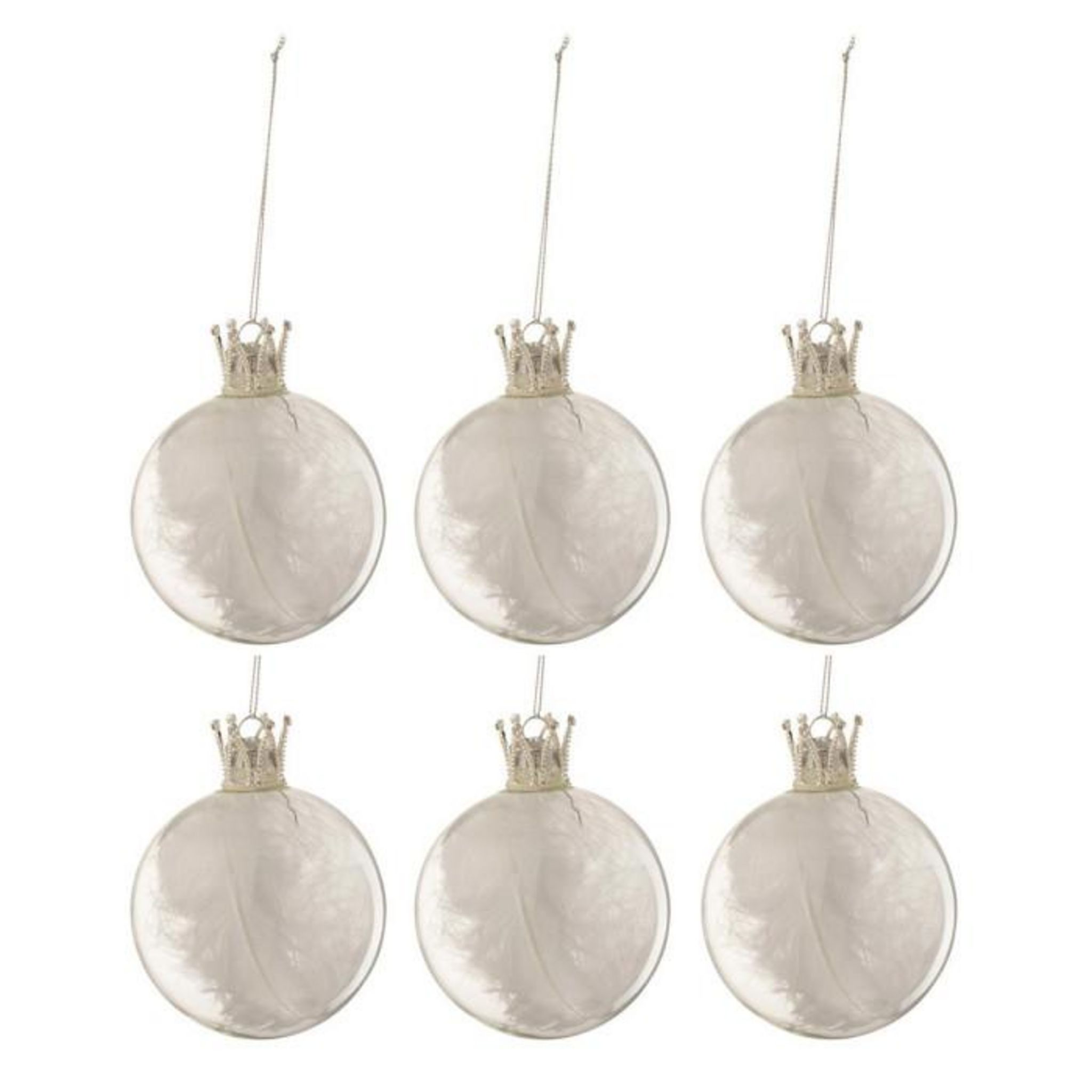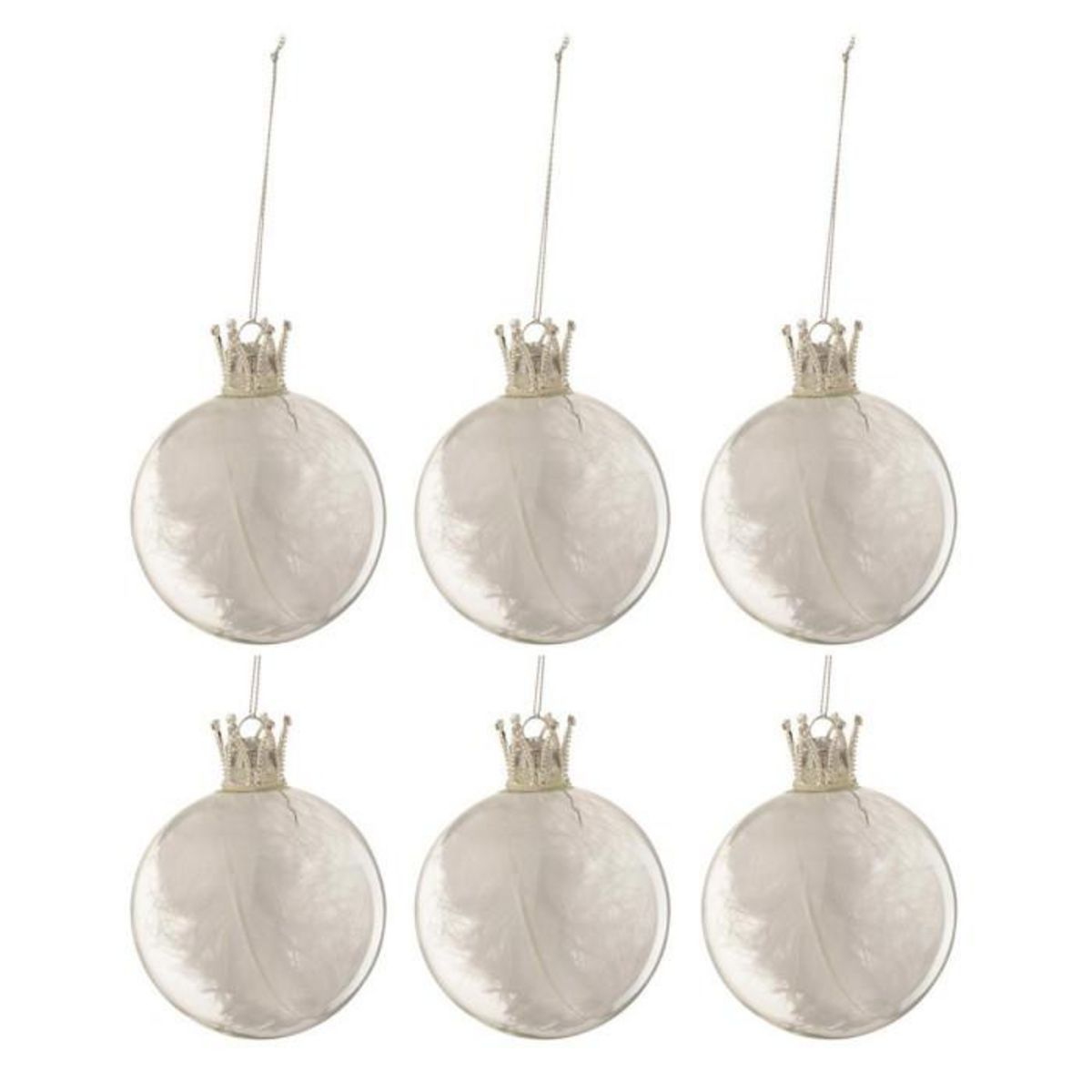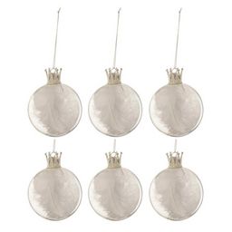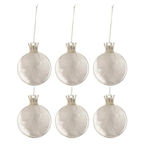 Informations Techniques : Dimensions : L. 8 x l. 8 x H. 8 cm Matière : Verre Spécificités : Design & Original Lot de 6 Boules de Noël Fome Ronde Design Couronne avec Plumes Poids : 0,027 kg Couleur : Blanc