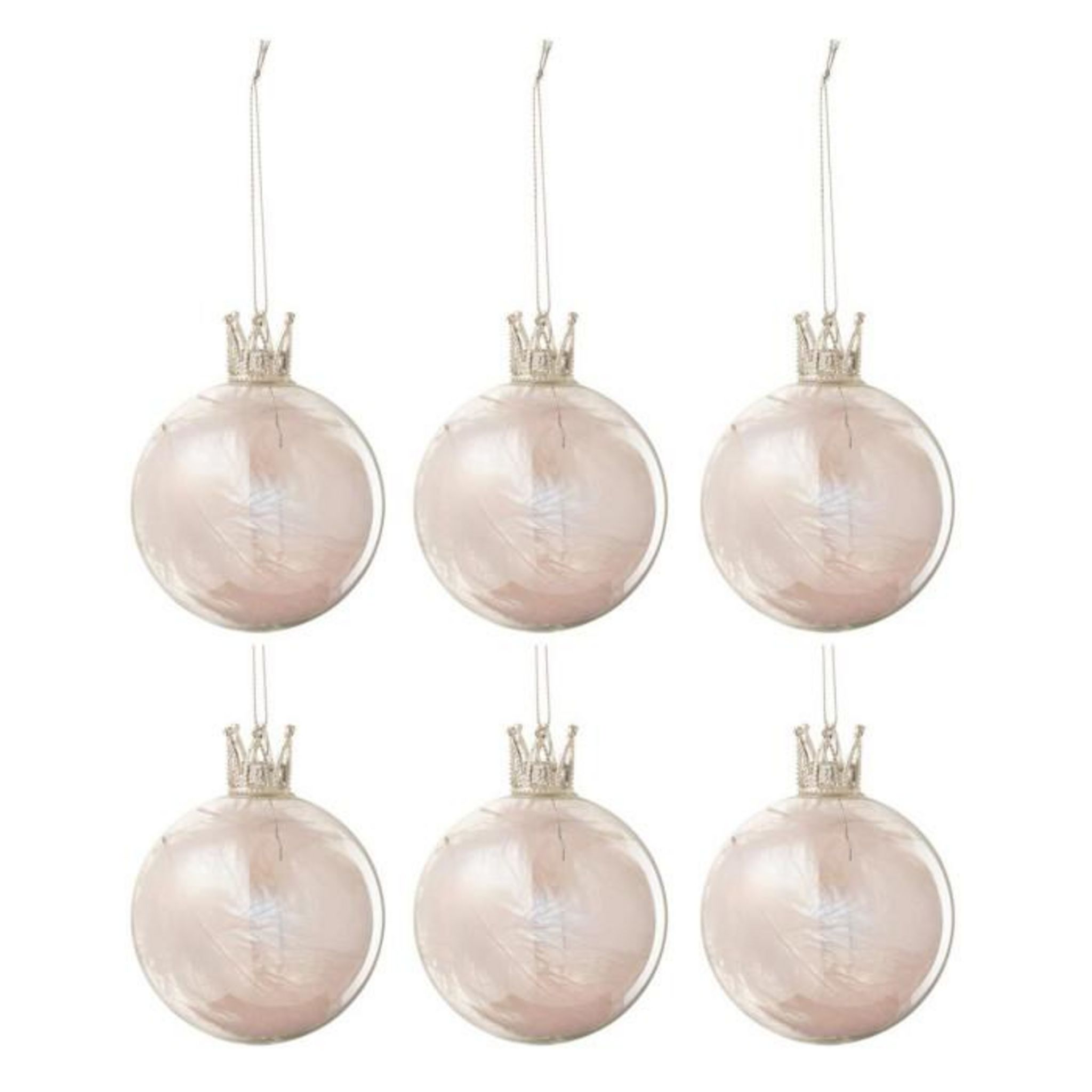 Informations Techniques : Dimensions : L. 8 x l. 8 x H. 8 cm Matière : Verre Spécificités : Design & Original Lot de 6 Boules de Noël Fome Ronde Design Couronne avec Plumes Poids : 0,027 kg Couleur : Rose