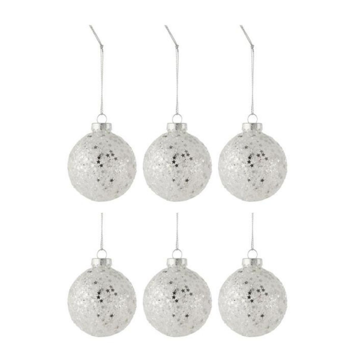 Informations Techniques : Dimensions : L. 8 x l. 8 x H. 8 cm Matière : Verre Spécificités : Pratique & Utile Lot de 6 Boules de Noël Forme Ronde Design Étoiles Poids : 0,046 kg Couleur : Argent