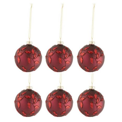 Informations Techniques : Dimensions : L. 8 x l. 8 x H. 8 cm Matière : Verre Spécificités : Design & Original Lot de 6 Boules de Noël Fome Ronde Design Feuilles Avec Paillettes Effet Mat Poids : 0,026 kg Couleur : Rouge Mat